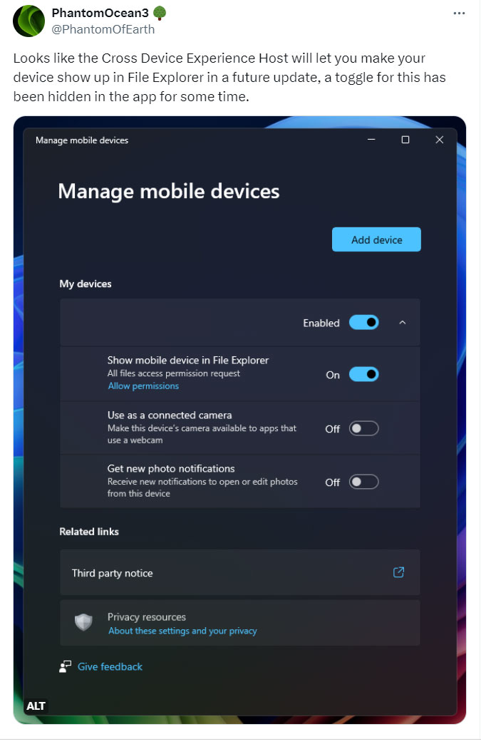 Nút chuyển đổi chịu trách nhiệm hiển thị điện thoại thông minh Android trong File Explorer đã được phát hiện bởi blogger công nghệ @PhantomOfEarth trên X: