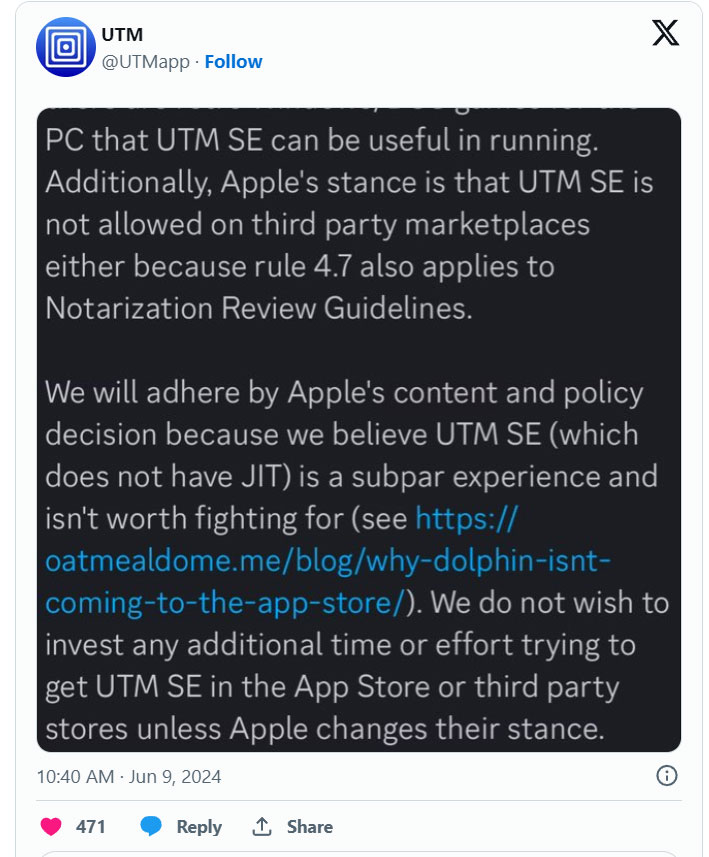 Hiện chưa rõ lý do thực sự khiến Apple không chấp nhận đệ trình UTM là gì. Có thể là đội ngũ đánh giá UTM đã truy cập ứng dụng không chính xác. Theo một bài đăng trên X, UTM sẽ không tiếp tục phản đối phán quyết và nói rằng việc nhận được sự chấp thuận đối với UTM SE (phiên bản được gửi để xem xét đã bị vô hiệu hóa Just In Time) không phải là điều đáng để đấu tranh.